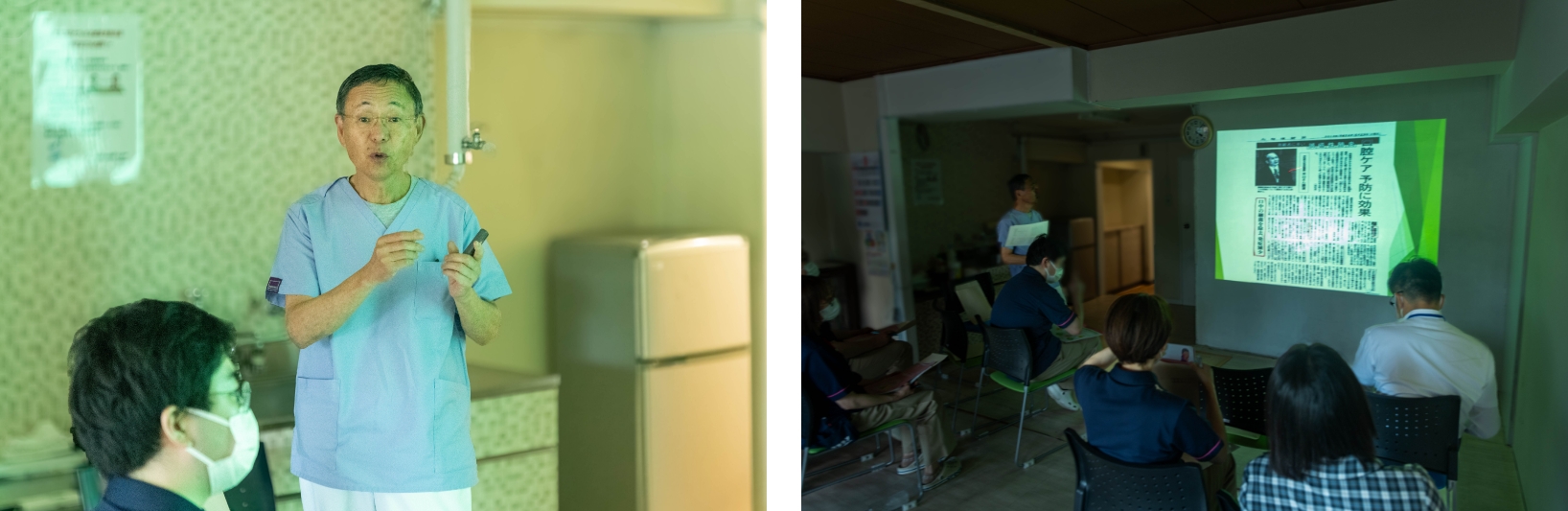 この日の講習会には、往診に同行する歯科衛生士と歯科助手3名も参加しました。日頃の診療現場で培った経験を共有していただき、実際のケアに即した具体的な工夫や配慮について学ぶことができました。たとえば、痛みに敏感な方への声掛けや、安定した姿勢を保つための補助など、日々の現場で役立つヒントが数多く紹介されました。