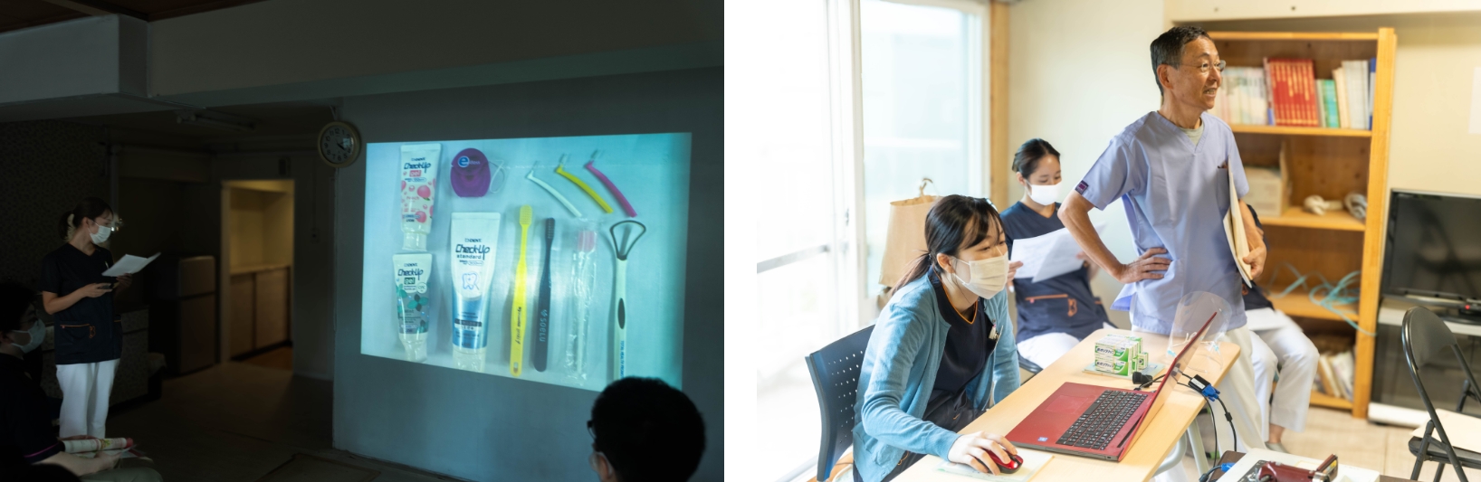 後半は歯科助手から、実際のケア用品や使用例について説明がありました。開口が難しい方への工夫や、短時間で効率的に行うためのテクニックなど、現場でそのまま役立つ知識が紹介されました。これにより、介護スタッフも日常のケアに具体的なアプローチを取り入れやすくなりました。